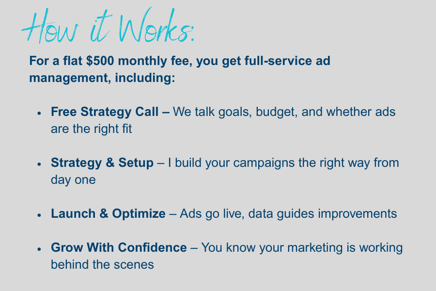 I love helping businesses grow, especially owners who know marketing matters but don’t want to spend nights and weekends figuring out ad platforms. That’s where I come in. I handle the strategy, setup, and ongoing management so you can stay focused on running your business.